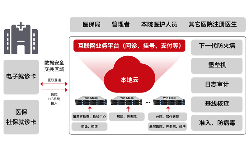 通过本地云,将第三方检查中心、居民、养老院、分院、协作医院等串联起来,构建互联网业务平台,覆盖问诊、挂号、支付等业务、提供数据安全的稳定服务